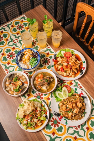传统家乡鸡汤,配豆芽、鸡丝、鸡蛋、土豆饼和脆饼,搭配白饭或米粉。